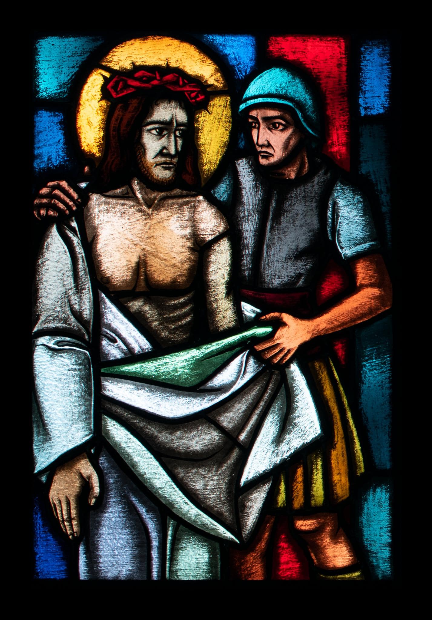 In vierzehn schmalen, in farbige Rechtecke gegliederten Rundbogenfenstern ist ein Kreuzwegzyklus dargestellt. Die Intensität der Farben nimmt nach unten zu. Hier wird Christus entkleidet.