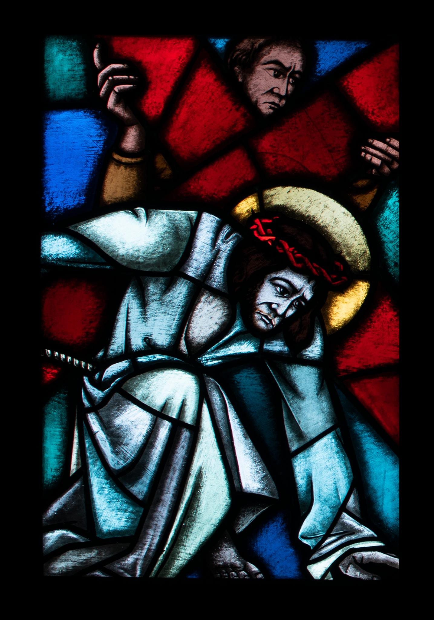 In vierzehn schmalen, in farbige Rechtecke gegliederten Rundbogenfenstern ist ein Kreuzwegzyklus dargestellt. Die Intensität der Farben nimmt nach unten zu. Christus fällt zum ersten Mal.