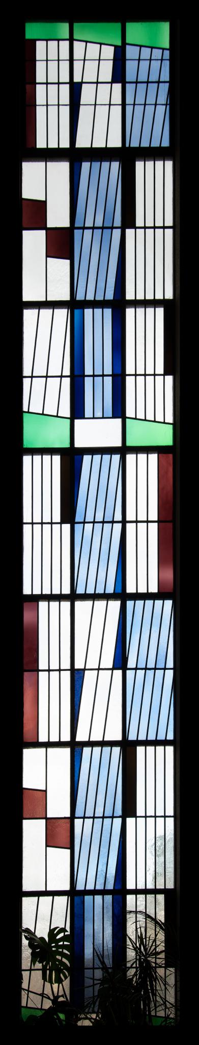 Das hochrechteckige Fenster zeigt eine abstrakte Komposition aus farblosen, blauen, grünen und braunen Vierecken.