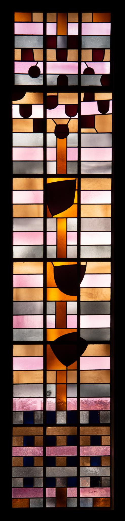 Das hochrechteckige Fenster zeigt farbige Rechtecke und christliche Symbole.