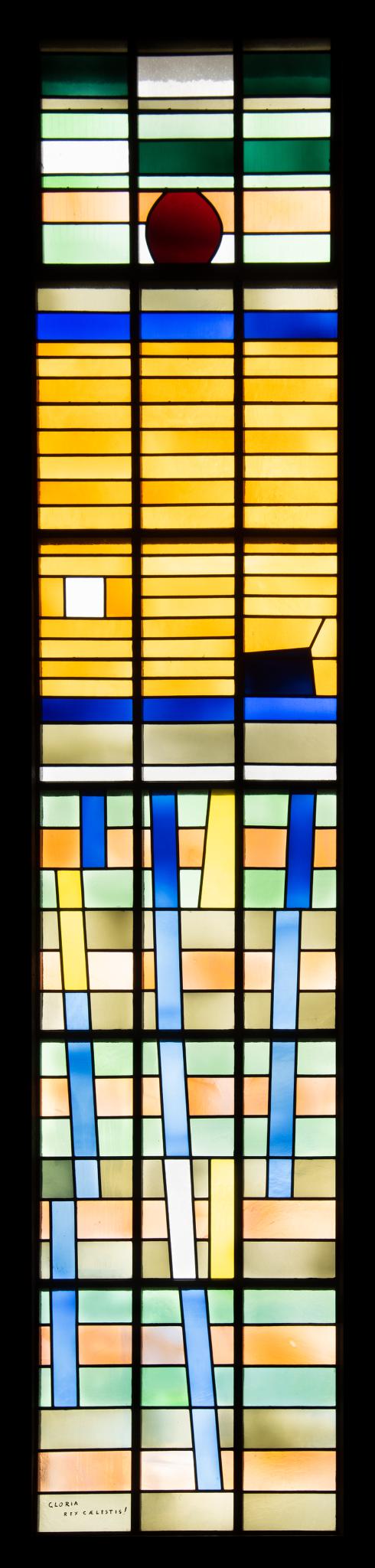 Das hochrechteckige Fenster zeigt farbige Rechtecke und christliche Symbole.