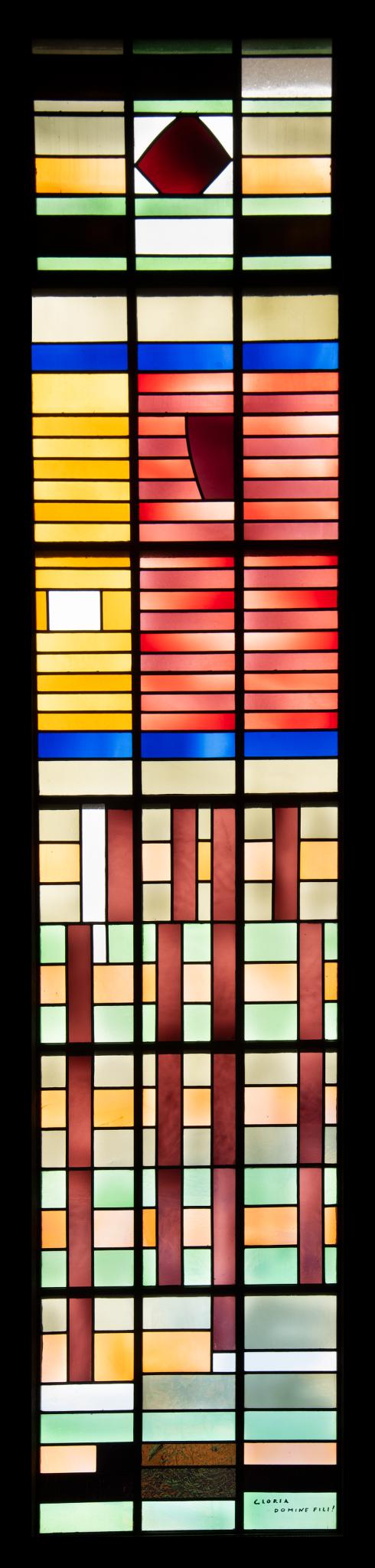Das hochrechteckige Fenster zeigt farbige Rechtecke und christliche Symbole.