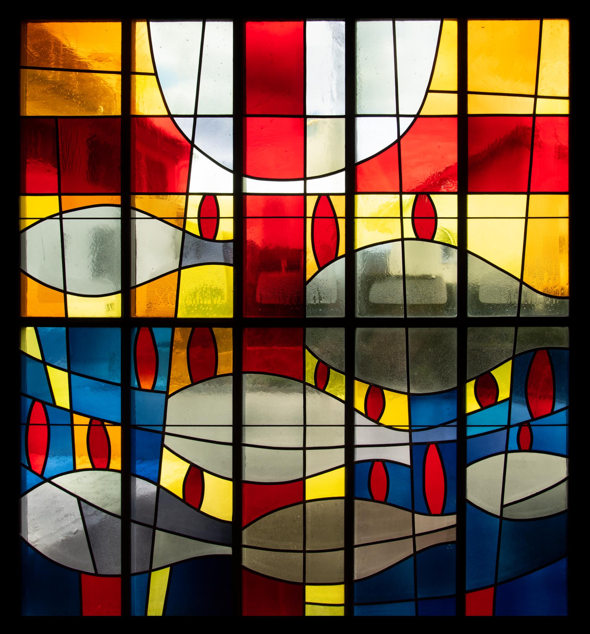 Annähernd quadratisches Fenster mit der Darstellung von Fischen im Wasser und einem Kreuz in Blau, Rot und Gelb als Versinnbildlichung des Taufgeschehens.