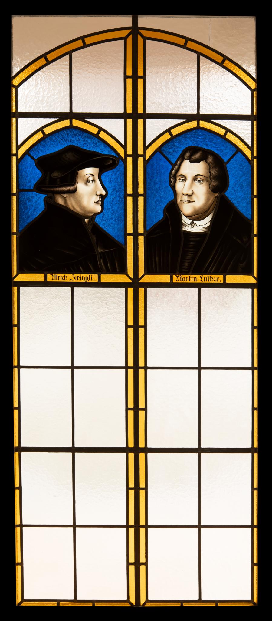 Verglasung aus blankem Mousselineglas mit gelbem Zierrahmen; im oberen Bereich werden die beiden Reformatoren Zwingli und Luther vor einem blauen Hintergrund dargestellt. Bildunterschriften in historisierender Schrift.