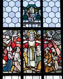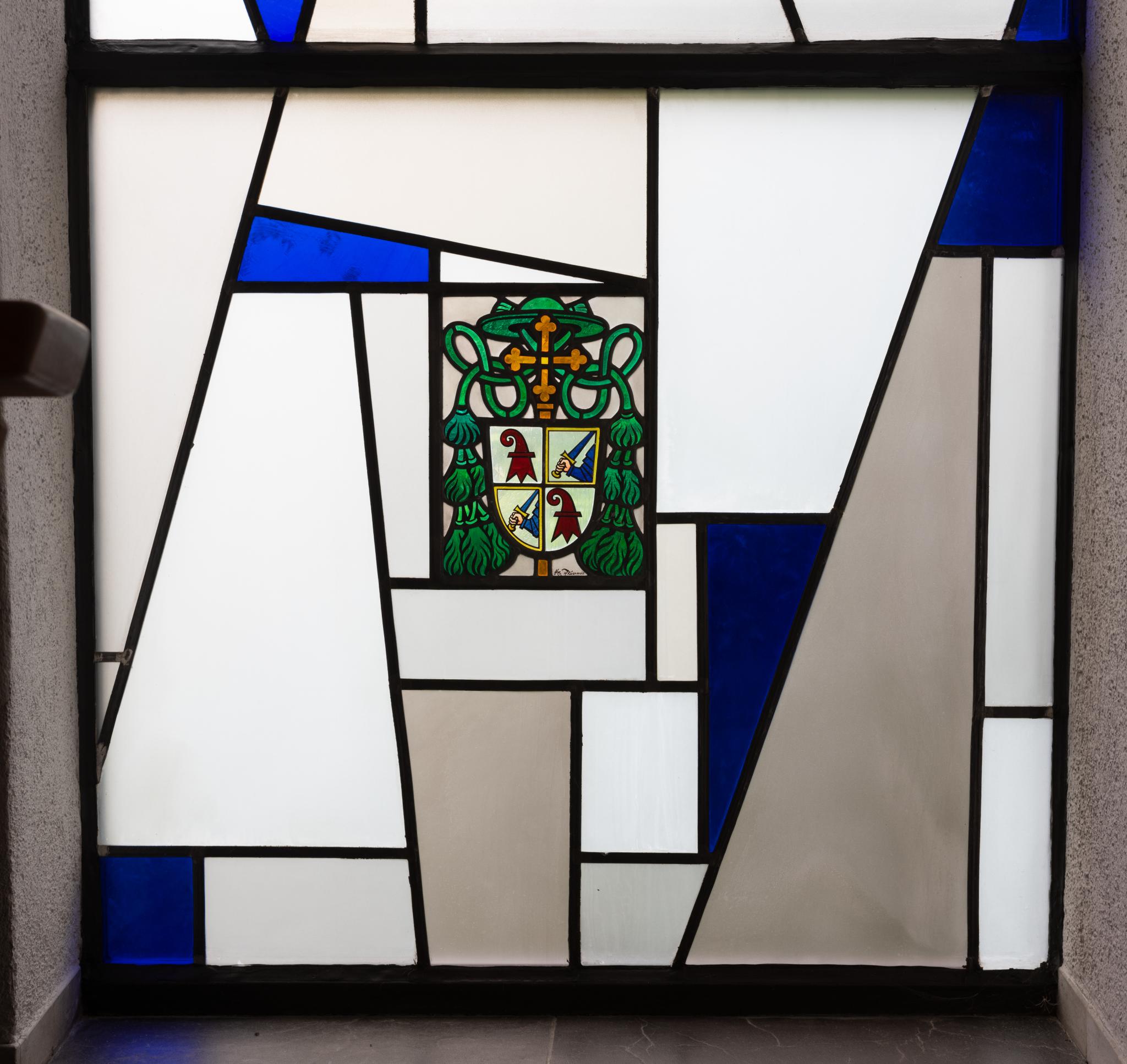 Fenster in grau-weissen geometrischen Formen, durchsetzt mit farbigen Formen sowie dem Vollwappen Franz von Streng.