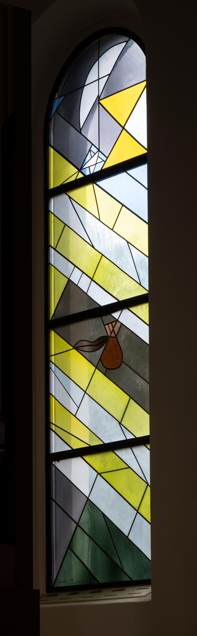 Rundbogenfenster mit diagonaler Gliederung und abstrakten Formen. Das vom zentralen Chorfenster, dem Sonnenscheiben-Fenster, ausgehende Licht überstrahlt die beiden seitlichen Rundbogenfenster. In der Mitte ist ein Geldbeutel, der auf den Verrat des Apostels Judas verweist, dargestellt. Im Bogenfeld erscheinen Kelch, Stern und Halbmond als Sinnbilder für die Szene auf dem Ölberg, in welcher Christus kurz vor seiner Gefangennahme in grosser Angst zu Gott betet (Lukas 22,42).