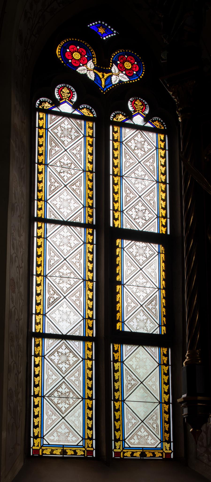 Masswerkfenster aus zwei Lanzetten mit Nonnenköpfen und Couronnement in Herzform. Die rautenförmig verglasten weissen Felder der Lanzetten sind mit einem sich wiederholenden Grisaille-Damastmuster geschmückt. Rahmung in gelb und blau mit Blattmuster. Masswerk mit farbigen Blatt- und Blumenornamenten sowie Stern.