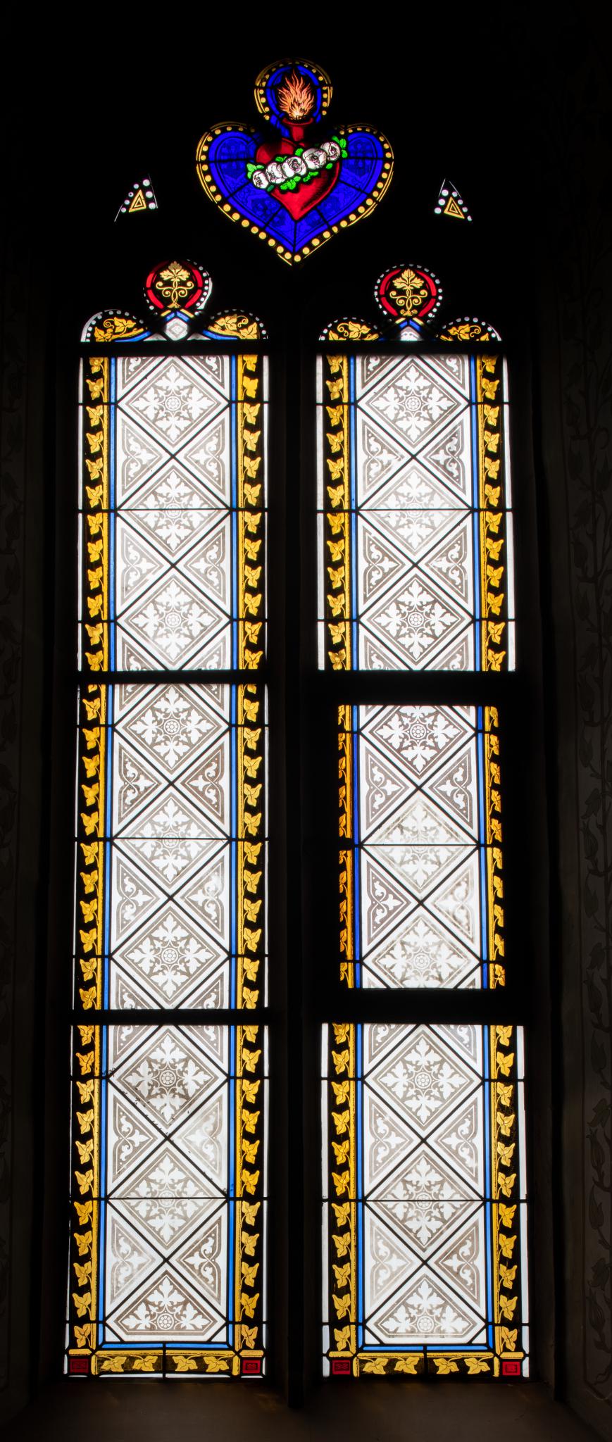 Masswerkfenster aus zwei Lanzetten mit Nonnenköpfen und Couronnement in Herzform. Die rautenförmig verglasten weissen Felder der Lanzetten sind mit einem sich wiederholenden Grisaille-Damastmuster geschmückt. Rahmung in gelb und blau mit Blattmuster. Masswerk mit farbigen Blatt- und Blumenornamenten sowie Stern. Im Couronnement das von einem Kranz aus weissen Rosen umwundene brennende Herz Mariens.