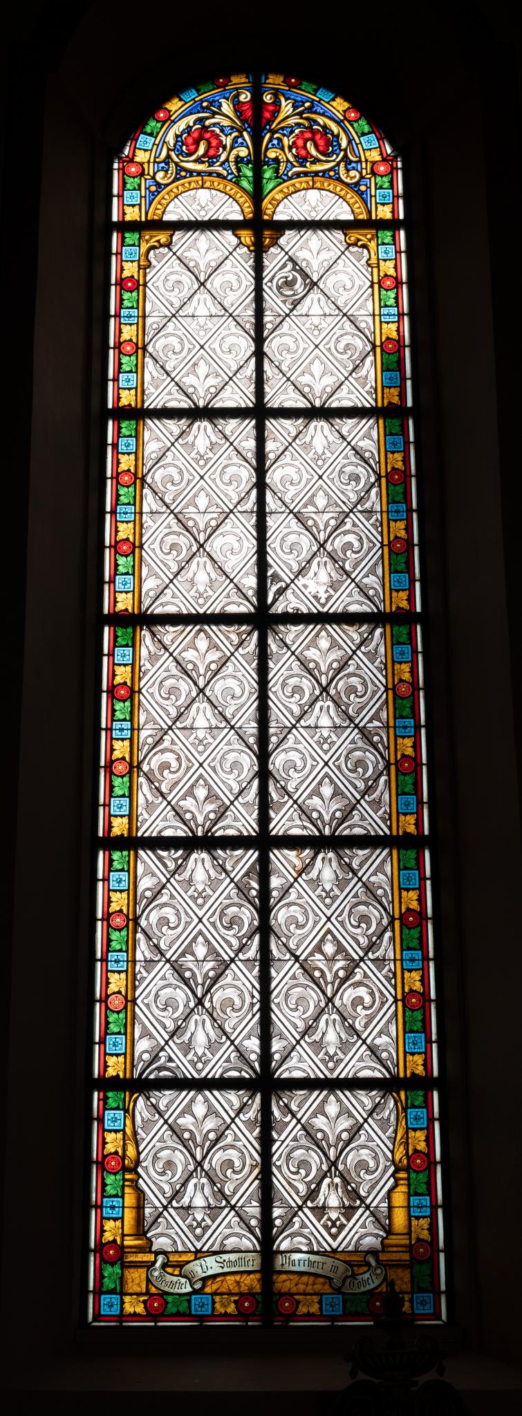 Rundbogenfenster mit Grisaille-Damastmuster, rundbogiger Arkadenrahmung und farbiger floraler Randverzierung. Im Bogenfeld Blattrankenmotiv. Schriftband an der Basis. Identisch mit n II.