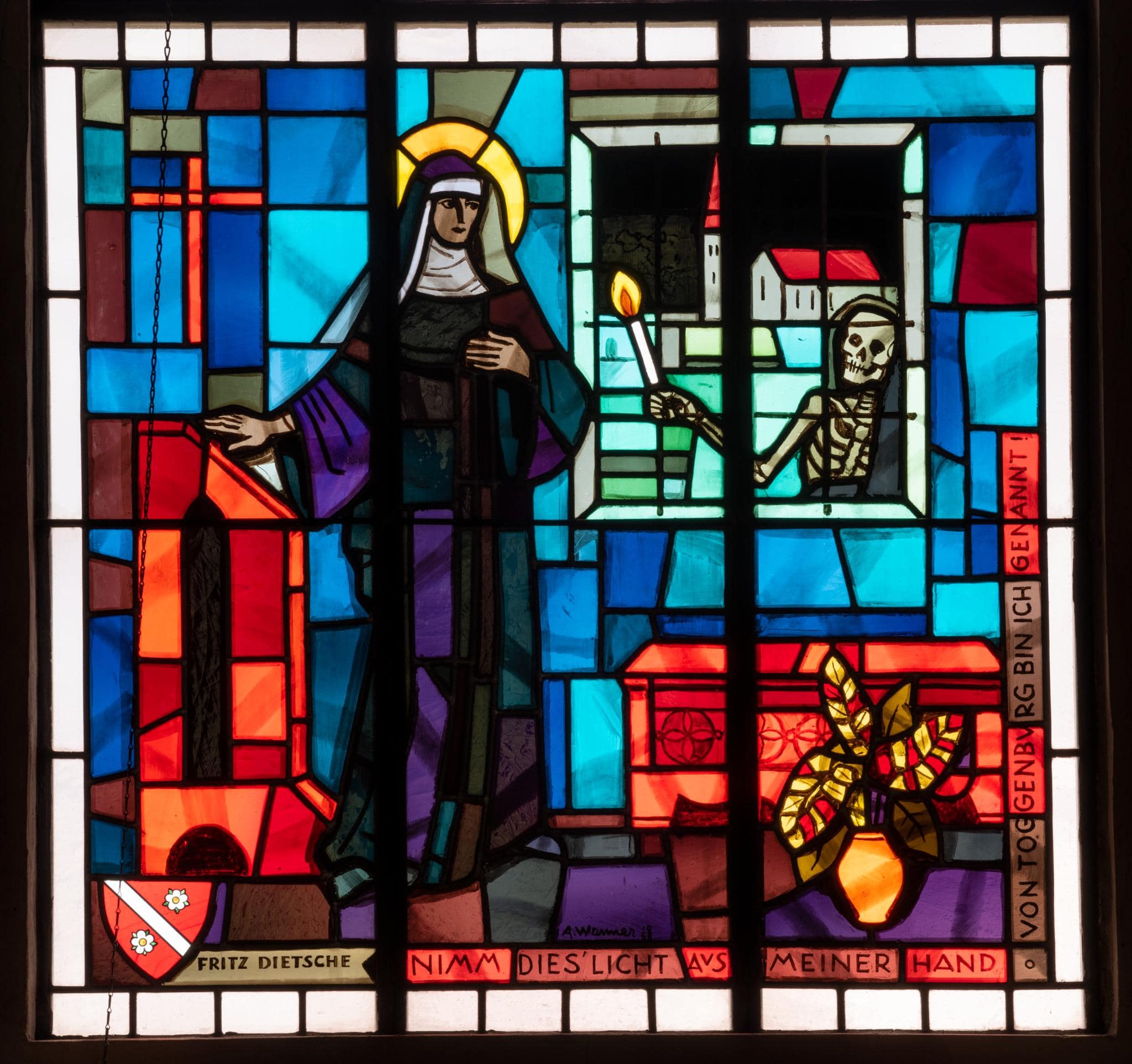 Als die heilige Idda als Inklusin eingeschlossen im Kloster Fischingen lebte, löschte ihr einmal der Teufel ihr Lichtlein aus. Da ging sie ans Fenster und bat einen dort liegenden Leichnam, ihr das Licht wieder anzuzünden. Der Tote stand auf, brachte ihr das Licht und sprach: “Nimm dies' Licht aus meiner Hand / von Toggenburg bin ich genannt!” Es war also ihr reuiger Gemahl Heinrich von Toggenburg, der sie hatte umbringen wollen. Hinter dem Skelett des Grafen ist die Kirche von Bettwiesen zu sehen. Links unten ist das Stifterwappen angebracht.