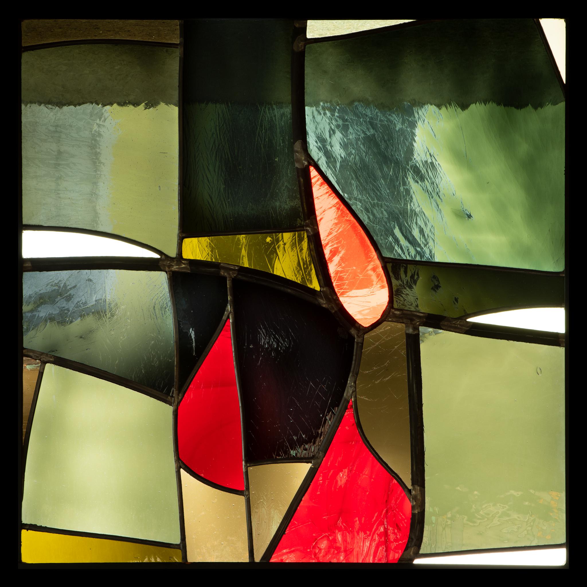 Die einzelnen Sujets befinden sich in einem durchgehenden Fensterband. Drei rote Formen treten aus grünlichen Vierecken hervor.