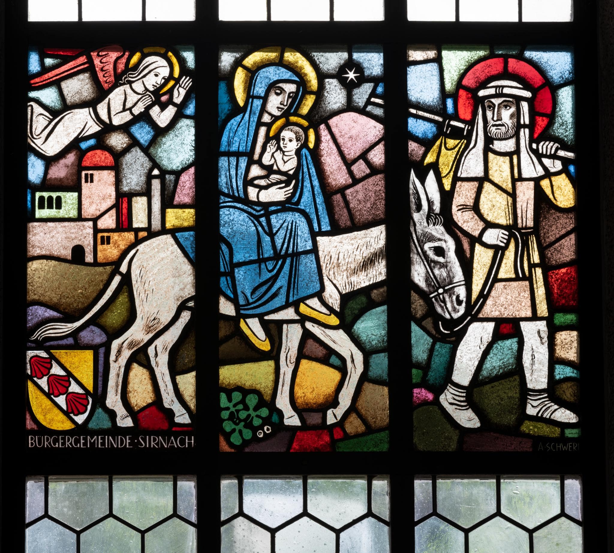Maria und Josef flüchten vor Herodes nach Ägypten. Maria reitet mit dem Kind in ihren Armen auf dem Esel, Josef führt ihn an einem Zügel. Hinter Maria erscheint der Engel, der sie vor Herodes gewarnt hatte. Links unten ist das Stifterwappen angebracht.