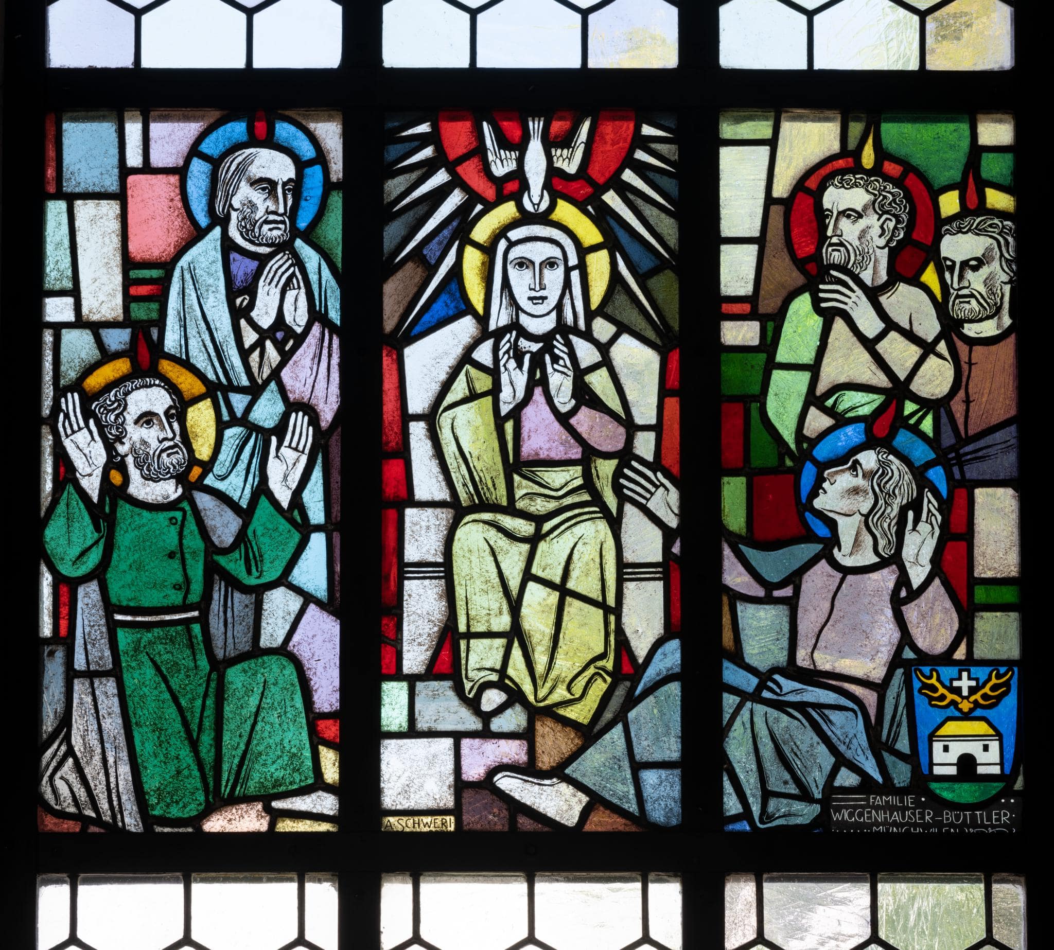 In der Mitte sitzt Maria, über ihr schwebt die Taube des Heiligen Geistes. Sie ist umgeben von den Aposteln, über deren Köpfen ein Flämmchen als Zeichen des Heiligen Geistes schwebt.