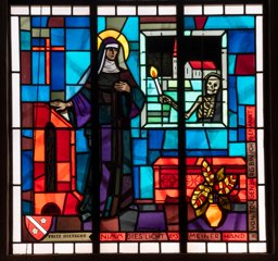 Doppellanzettfenster mit Nonnenköpfchen. Links ist ein Schwert, rechts ein Weihrauchgefäss umgeben von Flammen und sieben Augen dargestellt. Diese Symbole verweisen wohl auf die Offenbarung (4,8; 5,8; 19,12–15).