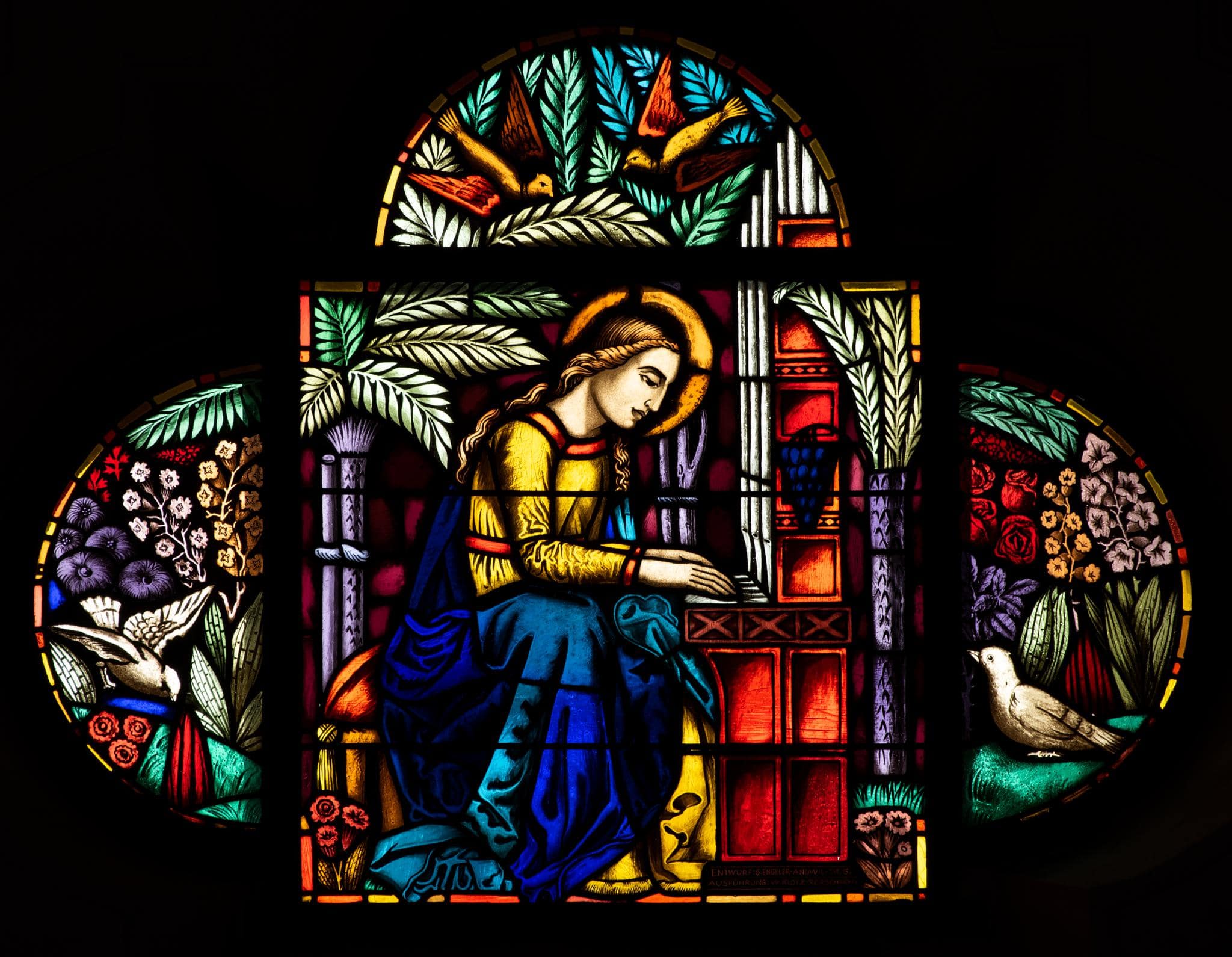 Dreipassfenster mit der orgelspielenden heiligen Cäcilia als Schutzpatronin der Musik. Blumen und Vögel umgeben die Heilige.