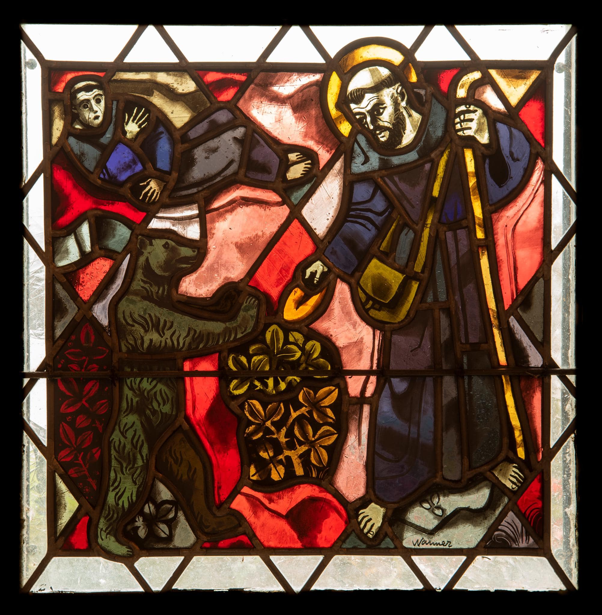 Rundbogenfenster. Gallus reicht dem Bären das Brot.