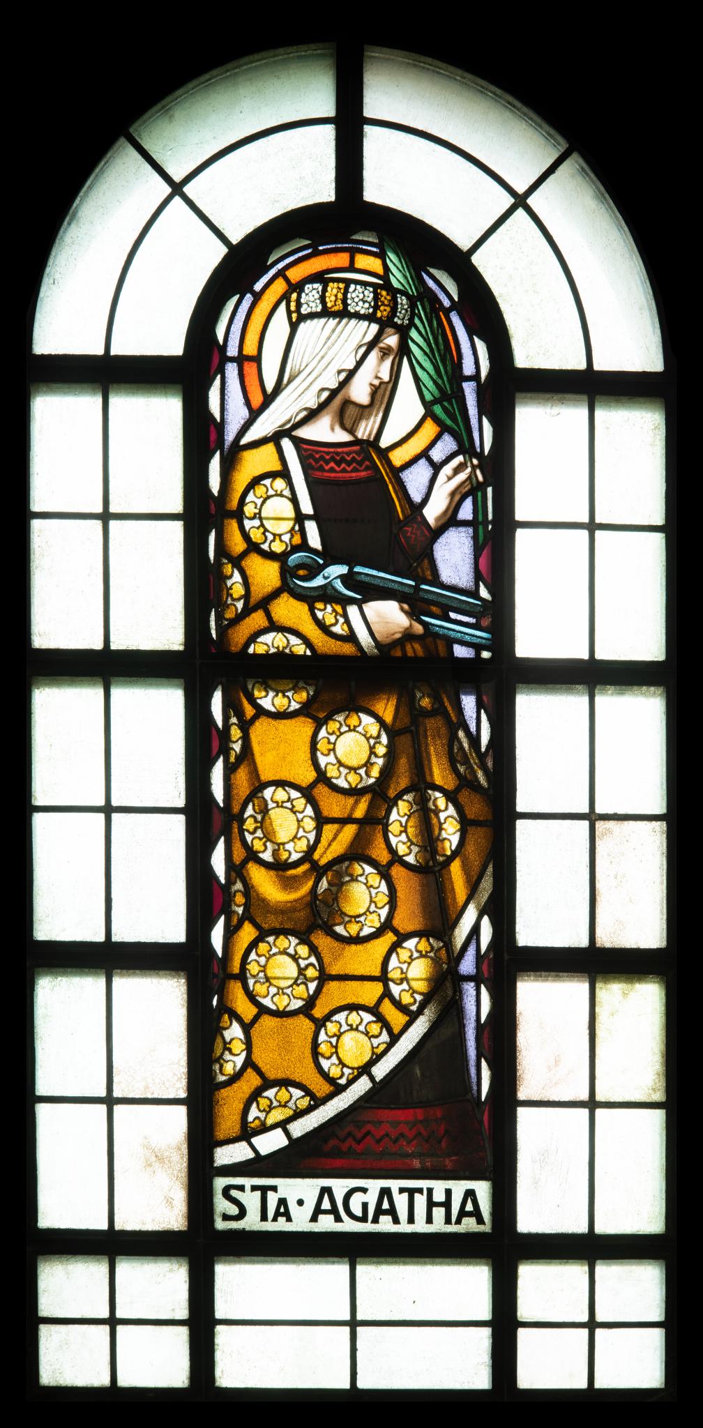 Mit opaken Rechtecken blank verglastes Rundbogenfenster mit der Darstellung der Ganzfigur der heiligen Agatha in den beiden zentralen Feldern. Die Heilige ist in einem reich geschmückten Umhang gezeigt, das Haar mit Blumenkranz und Schleier bedeckt. In den Händen hält sie Zange und Palmzweig als Zeichen ihres Martyriums. Unterhalb der Figur Namenszug.