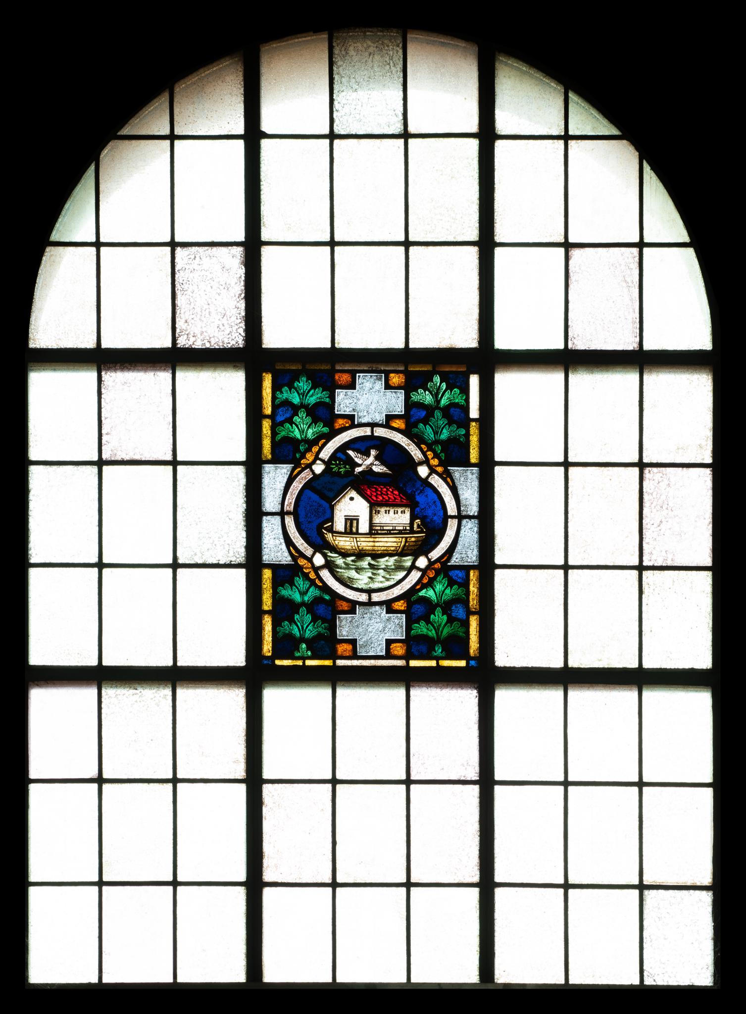 Mit opaken Rechtecken blank verglastes neunteiliges Rundbogenfenster. Im mittleren Feld eine Darstellung von Noahs Arche in einem Medaillon vor ornamentiertem Hintergrund. Die Arche ist als schwimmendes Boot gezeigt, das ein Haus trägt, hier wohl als Sinnbild der Kirche gemeint. Über der Arche fliegt die Taube mit dem Ölzweig im Schnabel.