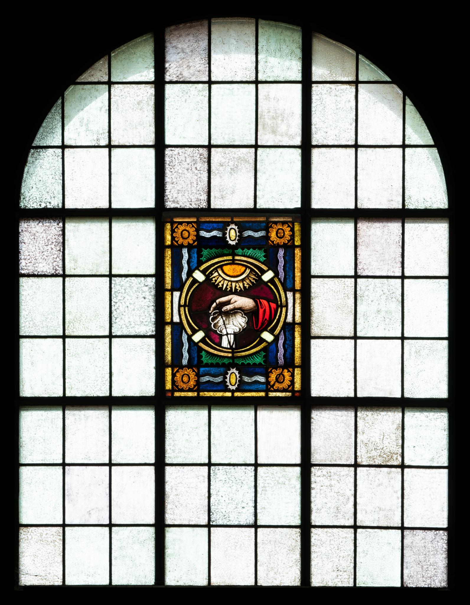 Mit opaken Rechtecken blank verglastes neunteiliges Rundbogenfenster. Im mittleren Feld eine Darstellung des Sakraments der Taufe in einem Medaillon vor ornamentiertem Hintergrund. Das Sakrament ist verbildlicht durch eine Hand, die Wasser aus einer Muschel ausgiesst; darüber erscheint ein Strahlenkranz.