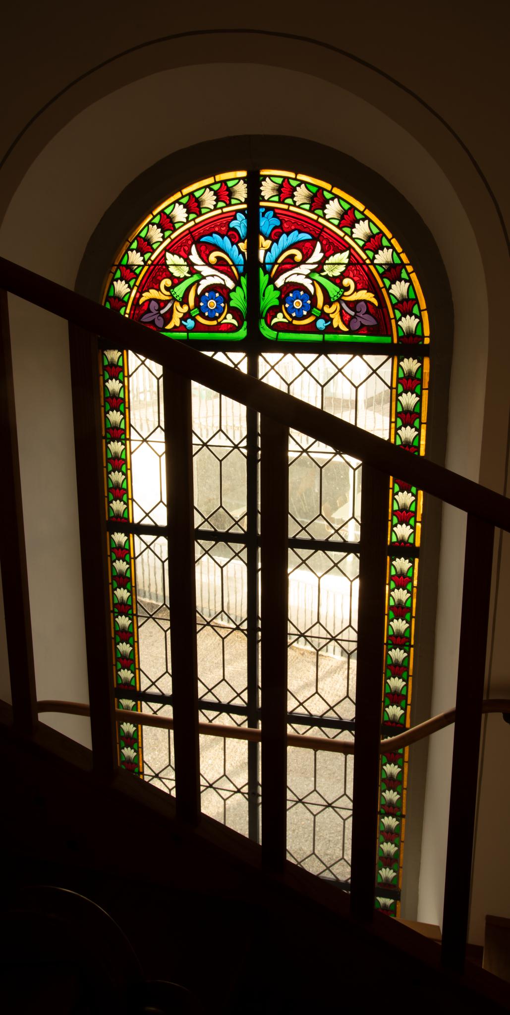 Rundbogenfenster mit Schweizerrauten in Blankverglasung; bunte Randverzierung mit Blumen und Blättern sowie Bogenfeld mit pflanzlichen Ornamenten, in den Farben Rot, Grün und Blau.