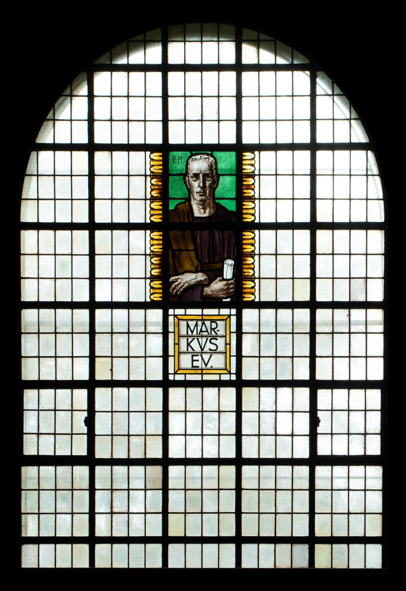 Grosses Rundbogenfenster mit blanker Rechteckverglasung, dessen Mitte ein Brustbild des Evangelisten Markus mit Schriftrolle ziert. Der Evangelist erscheint vor grünem Hintergrund, seitlich des Bildes verlaufen gelbe Ornamentbänder mit stilisierten Blättern, darunter ist der Name des Evangelisten in einem gelben Rahmen wiedergegeben.