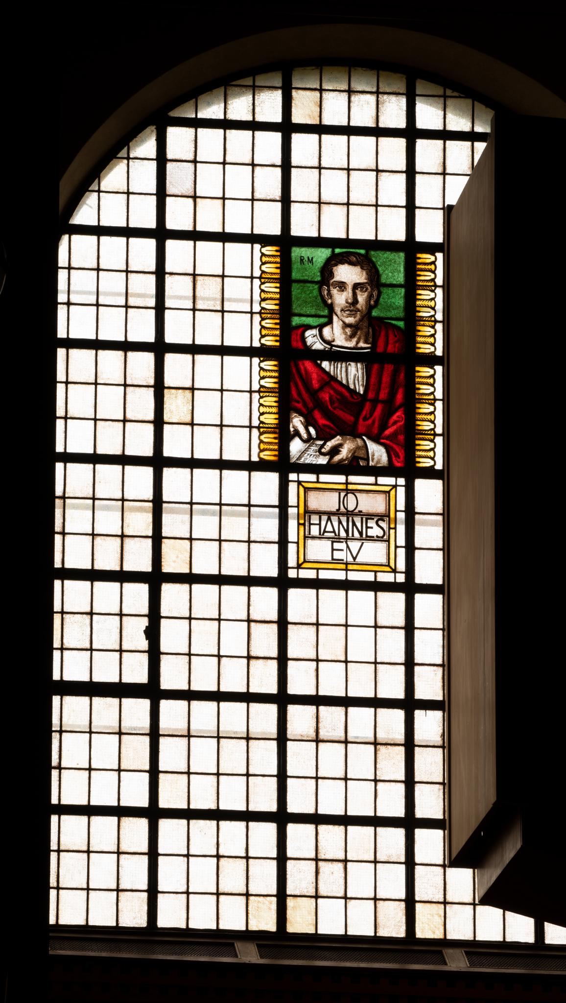 Grosses Rundbogenfenster mit blanker Rechteckverglasung, dessen Mitte ein Brustbild des Evangelisten Johannes mit einer halb ausgerollten Schriftrolle ziert. Der Evangelist erscheint vor grünem Hintergrund, seitlich des Bildes verlaufen gelbe Ornamentbänder mit stilisierten Blättern, darunter ist der Name des Evangelisten in einem gelben Rahmen wiedergegeben.
