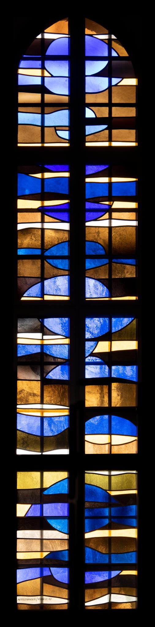 Hohes Spitzbogenfenster mit horizontalen Formen in Blau- und Brauntönen.