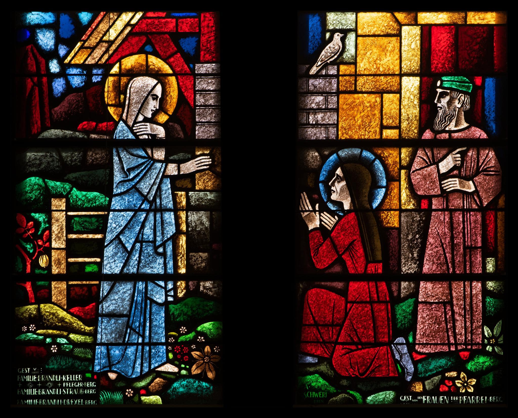 Hochrechteckige, schmale Fenster mit farbigen Rechtecken und Rahmenverzierung. Im unteren Drittel szenische Darstellungen aus dem Leben Mariens. Hier ist die Heimsuchung Mariae dargestellt. Maria grüsst die kniende Elisabeth. Im Hauseingang steht Elisabeths Mann Zacharias.