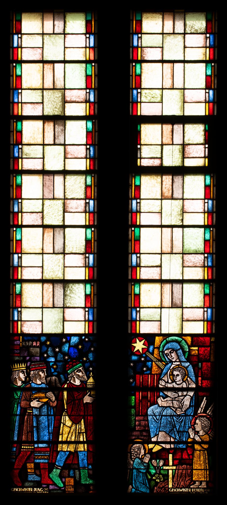 Hochrechteckige, schmale Fenster mit farbigen Rechtecken und Rahmenverzierung. Im unteren Drittel szenische Darstellungen aus dem Leben Mariens. Hier ist die Anbetung des Christuskindes durch die drei heiligen Könige dargestellt. Rechts sitzt Maria mit dem Kind, zu ihren Füssen zwei Engel. Links treten die Könige mit ihren Gaben heran.