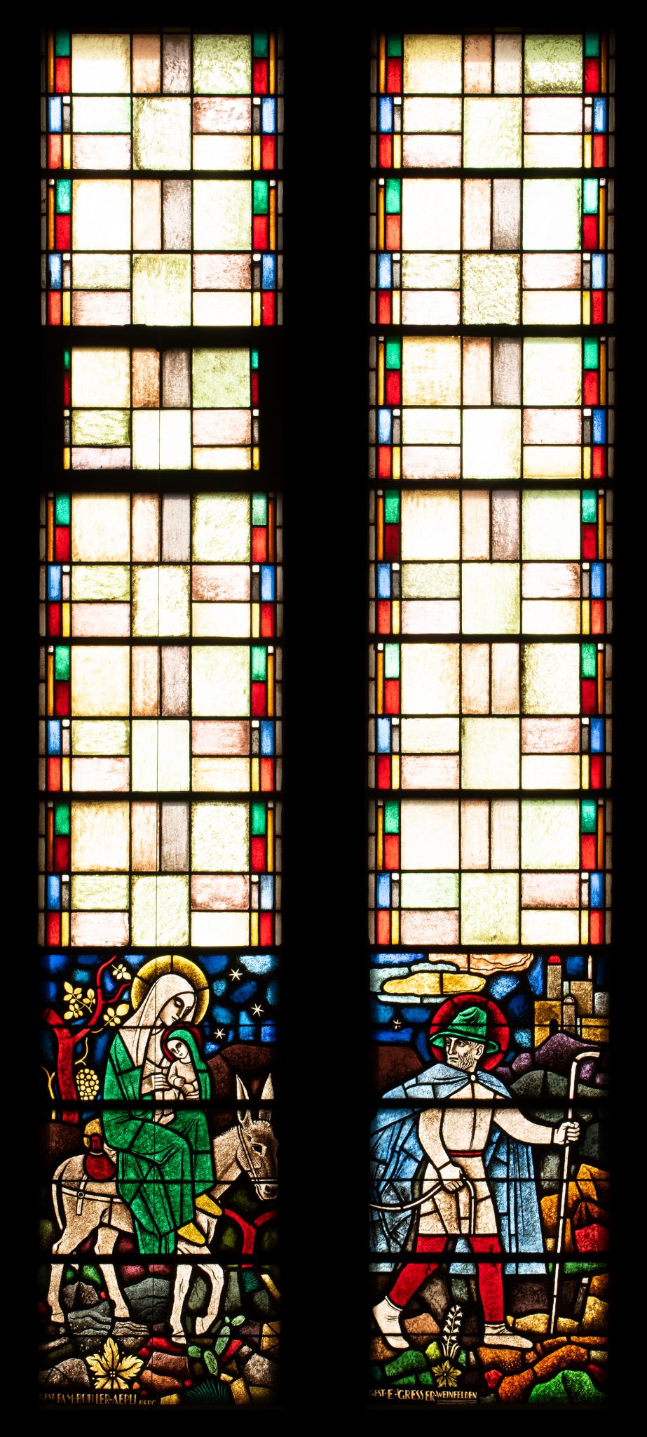 Hochrechteckige, schmale Fenster mit farbigen Rechtecken und Rahmenverzierung. Im unteren Drittel szenische Darstellungen aus dem Leben Mariens. Hier ist die Flucht aus Ägypten dargestellt. Links reitet Maria mit dem Kind auf dem Esel, rechts führt Joseph das Reittier am Zügel.