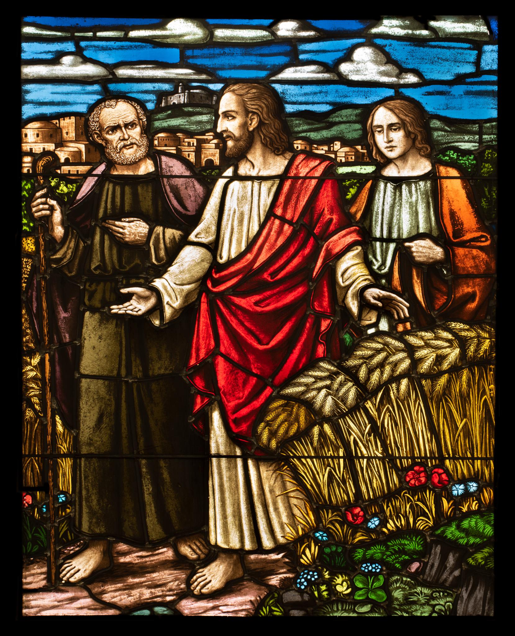 Blankverglastes zehnteiliges Segmentbogenfenster mit Glasmalerei im zweiten Register. Die Glasmalerei zeigt Jesus Christus auf einem Weg inmitten eines Ährenfeldes. Er wird von zwei Männern begleitet, bei denen es sich laut der ursprünglichen Inschrift unterhalb der Glasmalerei entweder um die Jünger Petrus und Andreas oder Jakobus und Johannes handelt, die kurz zuvor am See Genezareth dazu berufen worden waren, Jesus zu folgen. Im Hintergrund ist eine Stadt dargestellt.