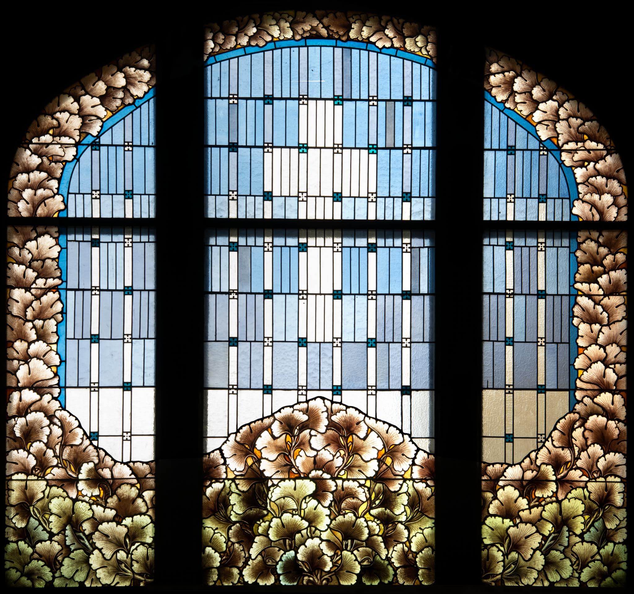 Grosses sechsteiliges Korbbogenfenster, dessen zentrales Raster aus hochrechteckigen Glasstücken ein Kreuz auf hellblauem Grund zeigt. Ein Jugendstilornament aus grünlich-braunen Gingko-Blättern füllt das untere Drittel des Fensters und umrahmt die gesamte Glasmalerei (identisch mit n II).