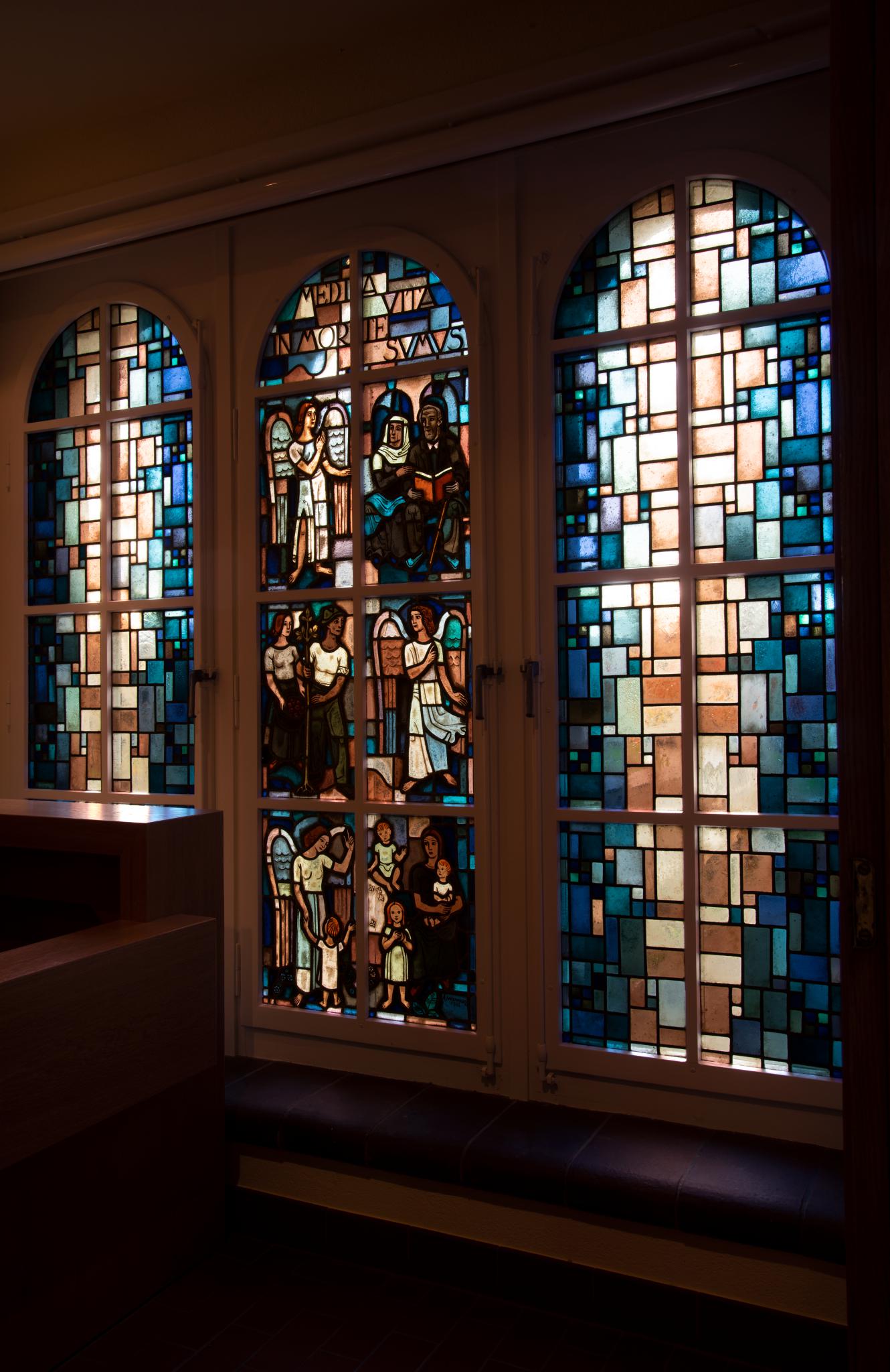 Drei Rundbogenfenster als dreiteiliges Fenster ausgeführt. In der Mitte mit Inschrift und szenisch gestaltet, die beiden äusseren Teile ornamental in Blau und Braun. Der figürliche Mittelteil zeigt Kinder, ein erwachsenes Paar sowie ein älteres Paar, jeweils mit einem Engel, der in den Himmel weist und die Menschen abholen kommt. Zuoberst ist die Inschrift angebracht.
