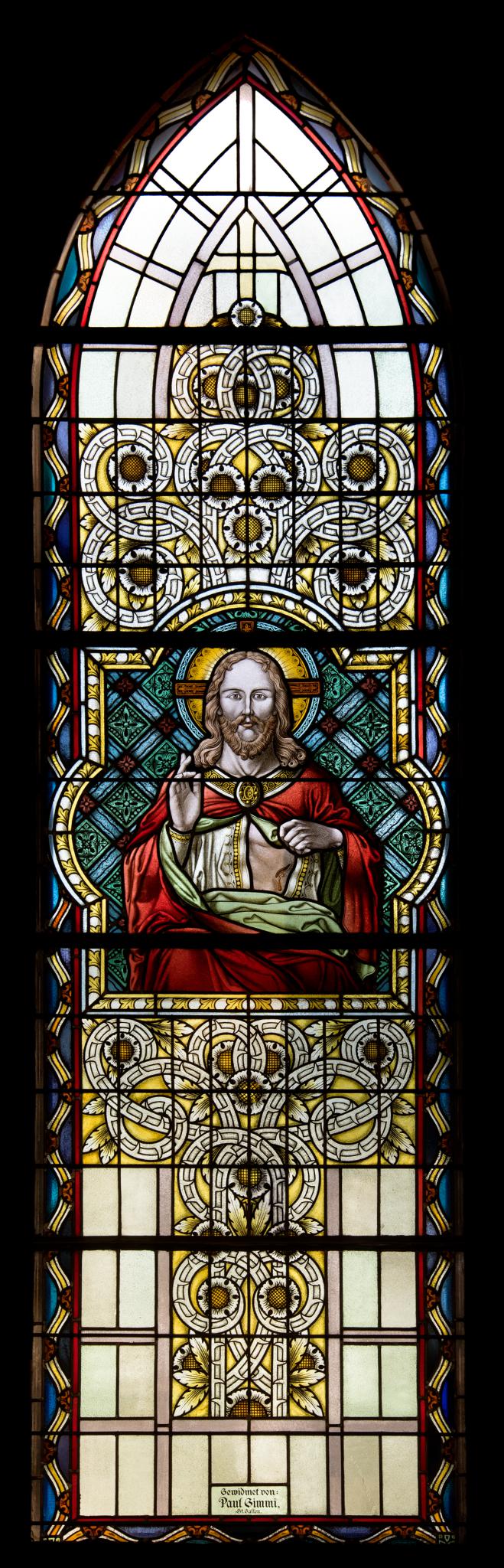 Fünfteiliges Spitzbogenfenster mit einem Medaillon im dritten Register, in dem Christus als thronende Halbfigur vor einem ornamentierten Hintergrund gezeigt ist. Die rechte Hand zum Segen erhoben, öffnet Jesus Christus mit der linken sein Gewand, um die Wunde auf seiner Brust zu zeigen. Ober- und unterhalb des Medaillons Ornament aus gewundenen Distelranken, von einem kleinen Kreuz gekrönt. Rahmenverzierung mit einem Wellenband in Blau, Gelb und Rot.
