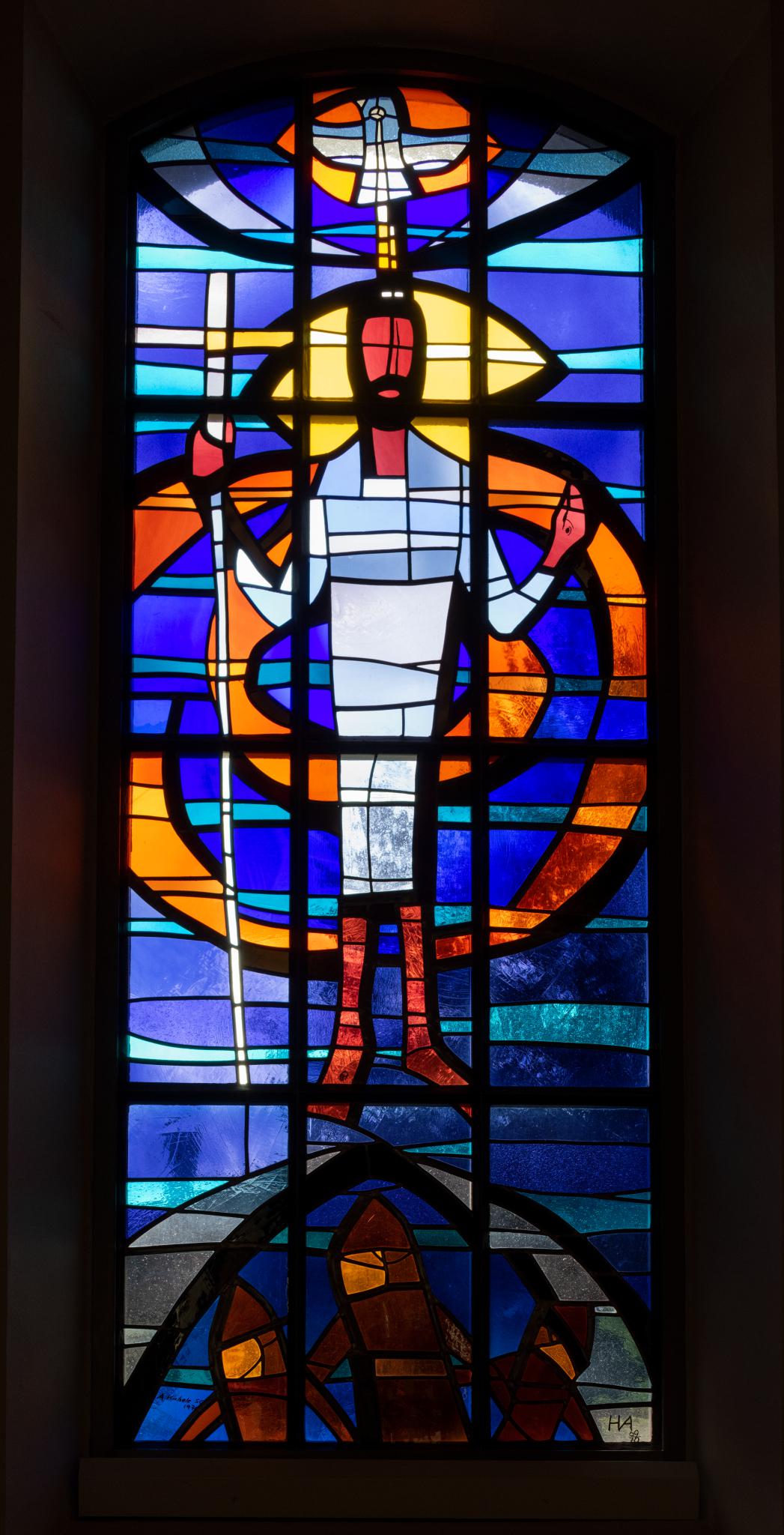 Flachbogenfenster in Blautönen. Der auferstandene Christus schwebt über den schlafenden Grabwächtern. Über ihm der heilige Geist als Taube.