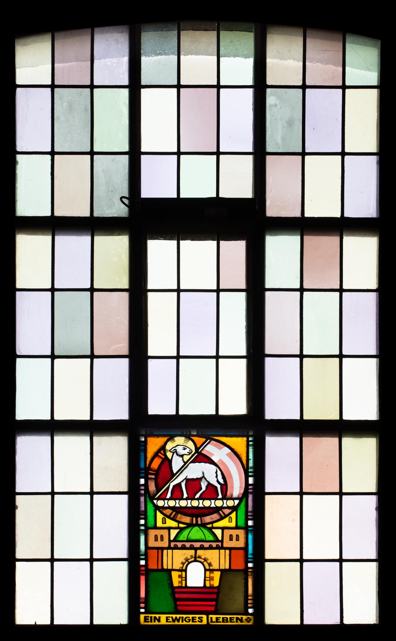 In zwölf Fenstern sind Sinnbilder des Apostolischen Glaubensbekenntnisses dargestellt. Hier steht das Lamm Gottes für das in der Inschrift und im Credo genannte “Ewige Leben”.