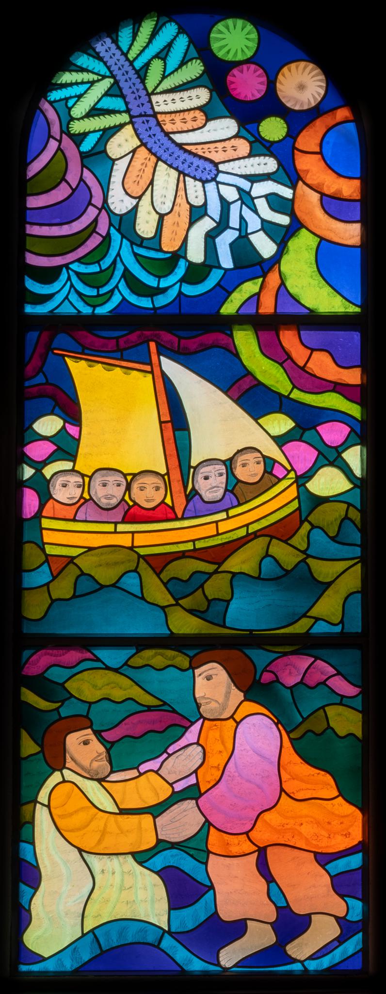 Rundbogenfenster mit Darstellung des Schiffs mit den Jüngern Jesu auf dem See Genezareth in Seenot. Am Scheibenfuss die Errettung des sinkenden Petrus durch den auf dem See wandelnden Jesus (Matthäus 14, 23–33).