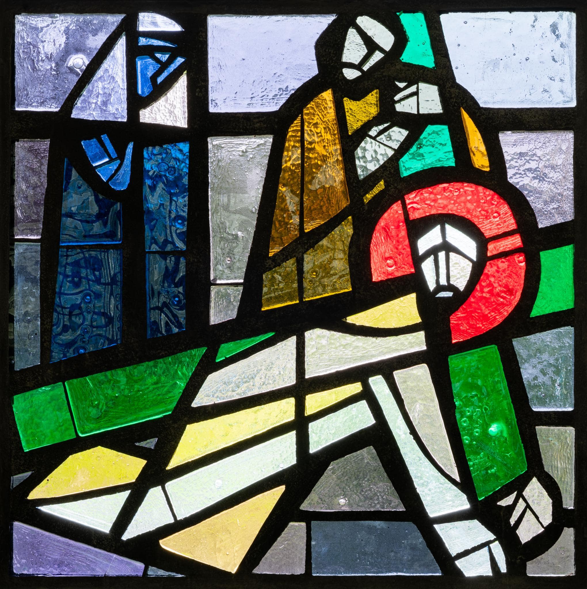 Quadratische Glasmalerei. Christus bricht unter dem Kreuz zusammen. Simon von Kyrene hilft Christus das Kreuz zu tragen und Maria begleitet ihn nach Golgatha.