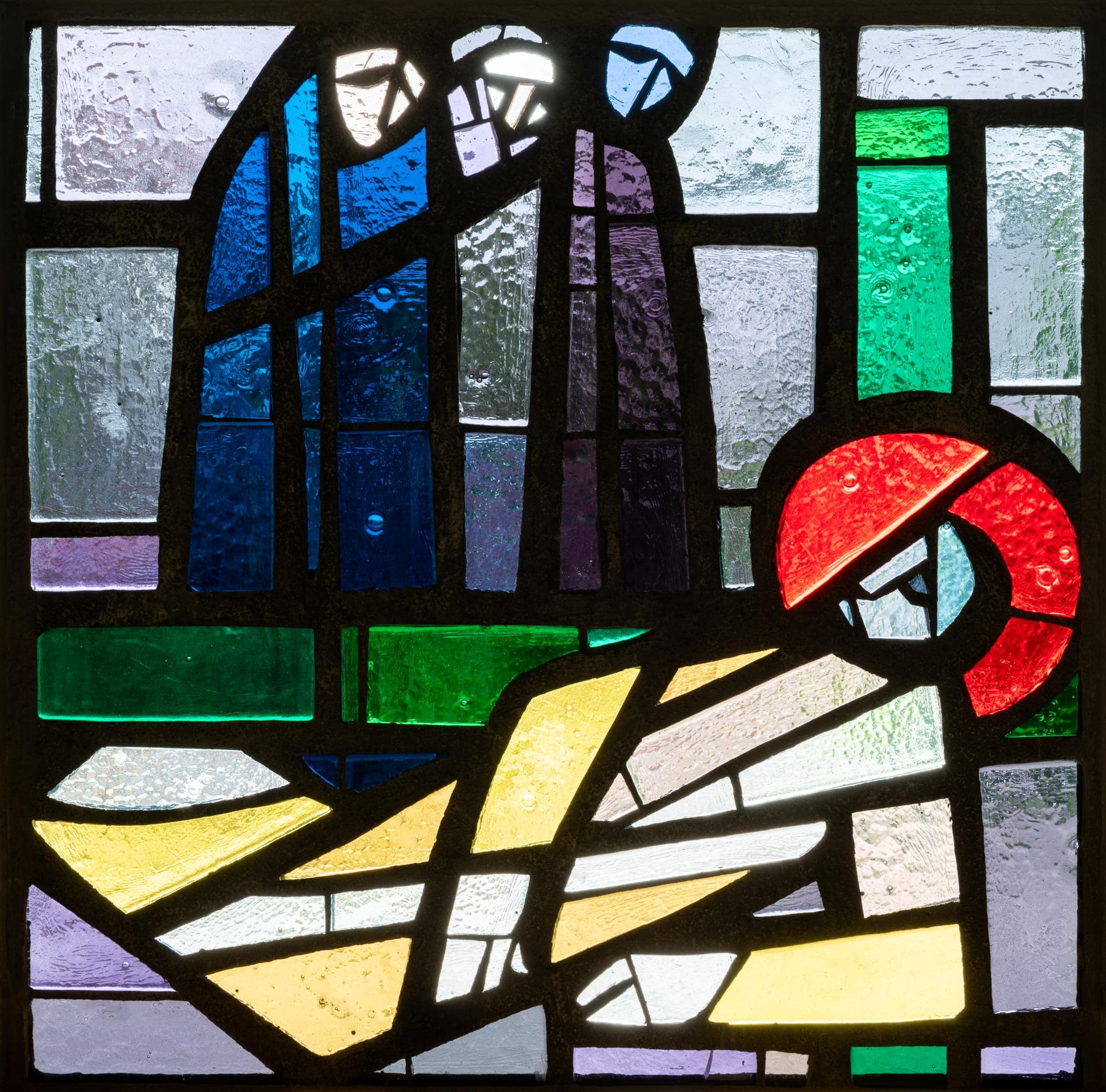 Quadratische Glasmalerei. Der das Kreuz tragende Jesus trifft auf seinem Weg nach Golgatha auf weinende Frauen.