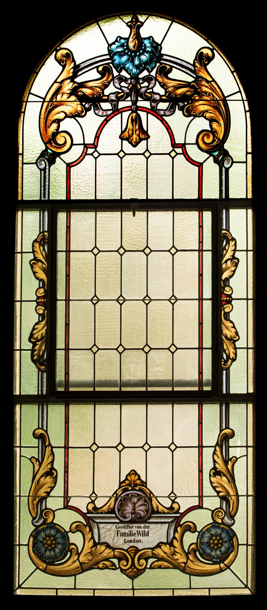 Rundbogenfenster mit einer breiten Rahmenbordüre aus Rocaillen, Blatt- und Blütenmotiven in den Farben Blau, Gelb, Rot und Lila. Die helle Fensterfläche ist durch dünne Bleistege in stehende Rechtecke geteilt. Im Sockelbereich Kartusche mit Stifterinschrift.