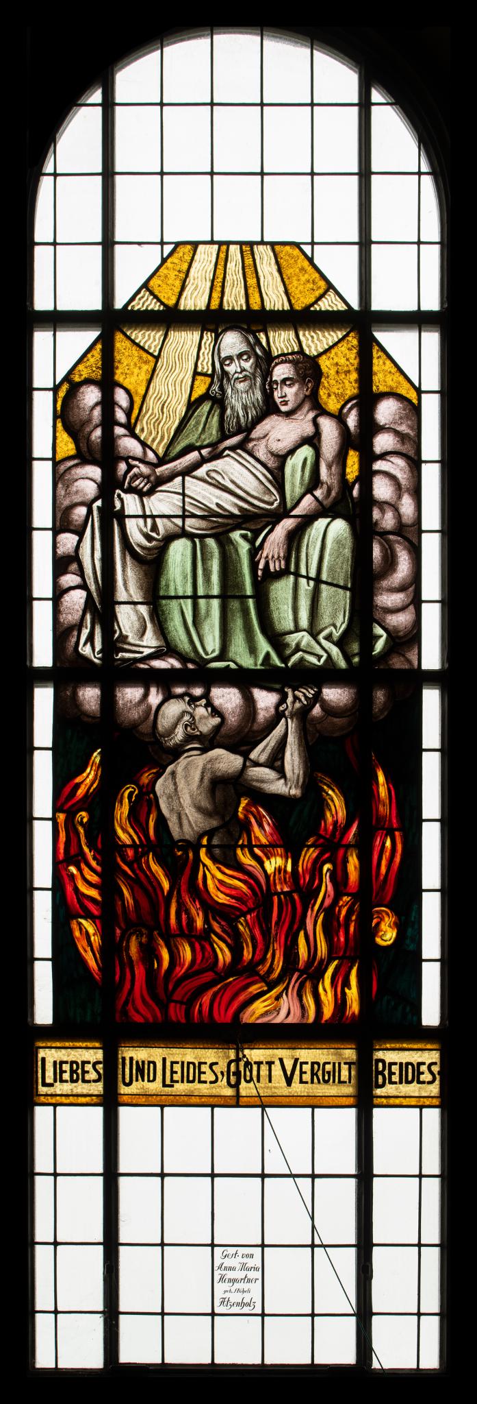 Mehrteiliges Rundbogenfenster mit Blankverglasung in Rechtecken und einem polygonalen Bildmedaillon im Zentrum. Darin sind Himmel und Hölle dargestellt. In der oberen Hälfte sitzt Gottvater mit einem Seligen auf dem Schoss auf einer Wolke, während ihn ein Sünder im darunter brennenden Fegefeuer um Erlösung anfleht. Unterhalb des Medaillons Spruchband.