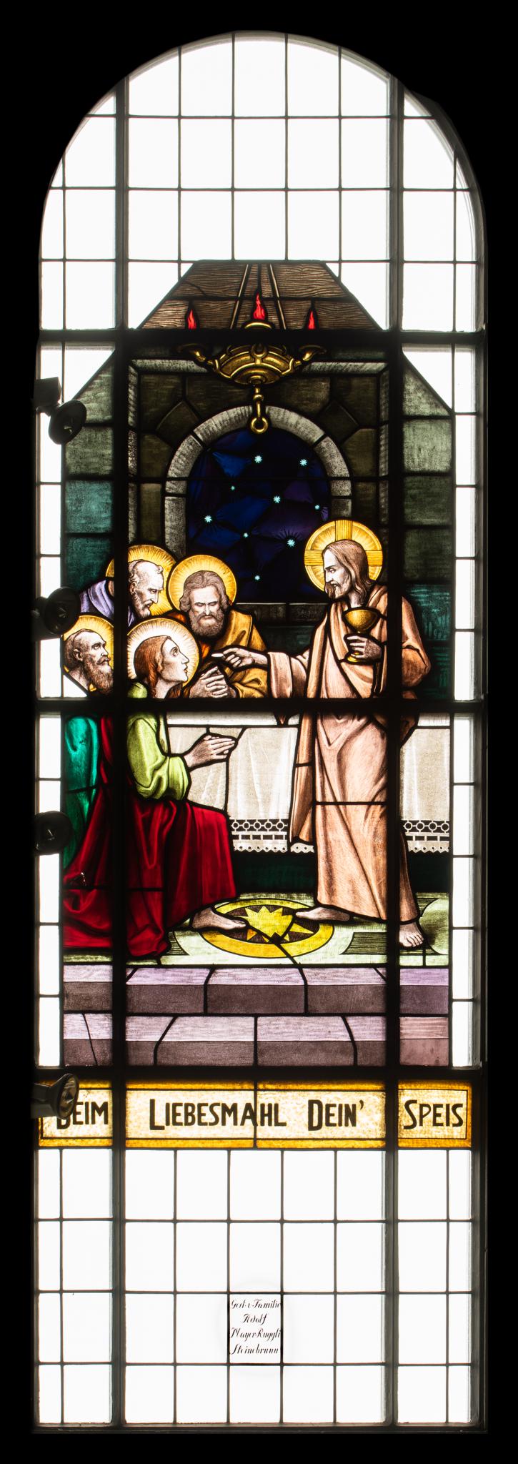 Aus einer undatierten Postkarte geht hervor, dass Lütz & Elmpt die farbigen Gläser aus dem Ruhrgebiet bezogen. Da dieses 1923 aufgrund ausstehender Reparationen von französischen Truppen besetzt wurde, rechneten Lütz & Elmpt mit Lieferschwierigkeiten: “Die Oefen werden ausgeblasen infolge der Besetzung durch die Franzosen” (Katholisches Kirchgemeindearchiv Steinebrunn-Egnach, B 17.2.04/4; Postkarte von Lütz & Elmpt, 1923). Im September 1923 erhielt die Firma eine Auszahlung von 3’800 Franken, was darauf hindeutet, dass bis dahin ein Grossteil der Fenster eingesetzt werden konnte (Katholisches Kirchgemeindearchiv Steinebrunn-Egnach, B 17.2.04/4; Brief von Lütz & Elmpt vom 13.9.1923).