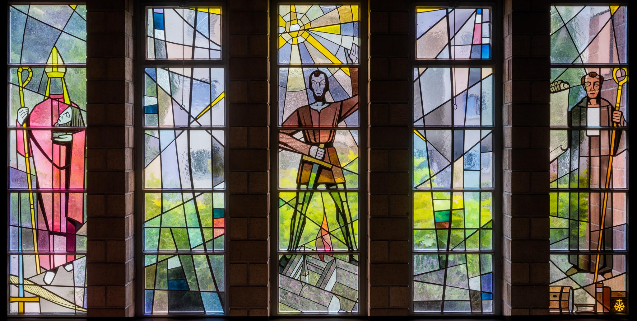 Fünfteiliges Fenster mit Darstellung dreier Patrone. Links steht der heilige Dionysius, Patron der Stadtkirche und der Stadt Diessenhofen, im roten Mantel mit seinem abgetrennten Haupt auf dem Arm. Niklaus von Flüe (Bruder Klaus), Namenspatron der katholischen Kirche Diessenhofen, bewahrt als Soldat das Kloster St. Katharinenthal vor der Zerstörung. Rechst steht der heilige Othmar mit Abtstab und seinem Attribut, einem Weinfässchen. Der heilige Othmar, Abt von St. Gallen, hatte im Jahr 757 das Dorf Diessenhofen und die dortige Kirche vom Priester Lazarus erhalten. In seiner Hand hält der Heilige die Schenkungsurkunde. Unten rechts ist das Wappen Buck angebracht.