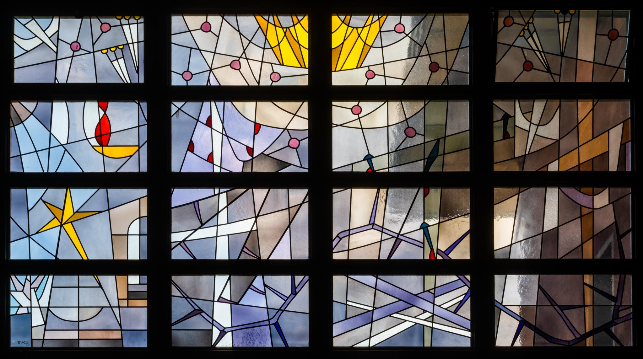 Rechteckiges Fenster mit Darstellung des Rosenkranzes. Die glorreichen und freudenreichen Geheimnisse des Rosenkranzes sind links in helleren Tönen versinnbildlicht, rechts und unten in dunkleren Farbtönen die schmerzhaften Geheimnisse. Über den Dornen schwebt eine goldene Krone, die auf Maria als Königin des Rosenkranzes verweist. Die roten Punkte stehen ebenfalls für die fünfzehn Geheimnisse des Rosenkranzes.