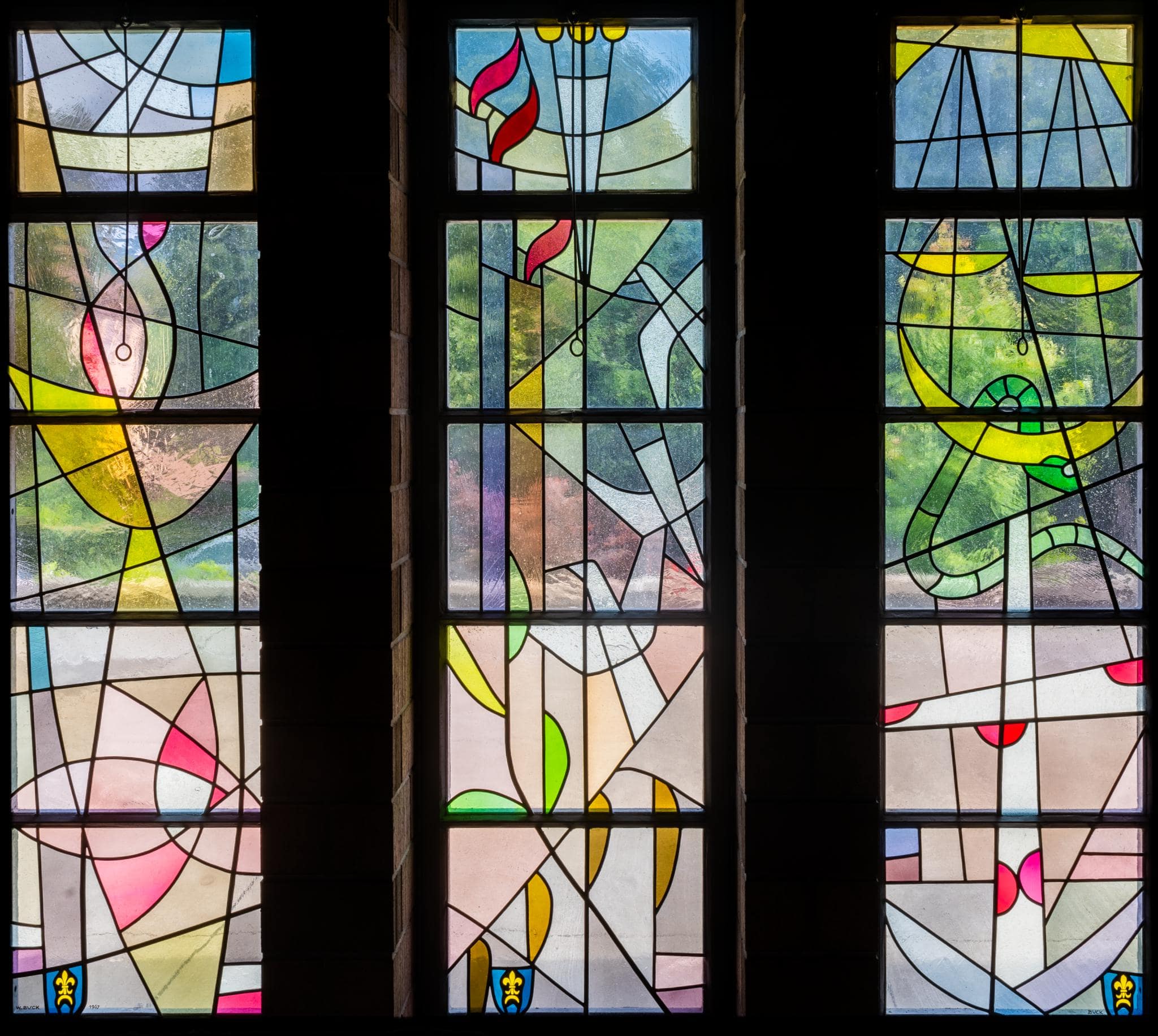 In den drei Fenstern der Marienkapelle erscheinen Mariensymbole. Viele davon entstammen der Lauretanischen Litanei, einem Gebet an die Gottesmutter. Links sind die Anrufungen Marias als Kelch und als geheimnisvolle Rose repräsentiert. In der Mitte sind Tauben, Kerzen sowie Samen und Pflanze zu sehen. Im rechten Fenster ist unten das Kreuz mit roten, auf die fünf Wundmale Christi verweisenden Formen dargestellt. Darüber erscheint die von der Mondsichel zertretene Schlange (Offb 12) und zuoberst eine Waage als Symbol für Maria als Spiegel der Gerechtigkeit (Lauretanische Litanei).