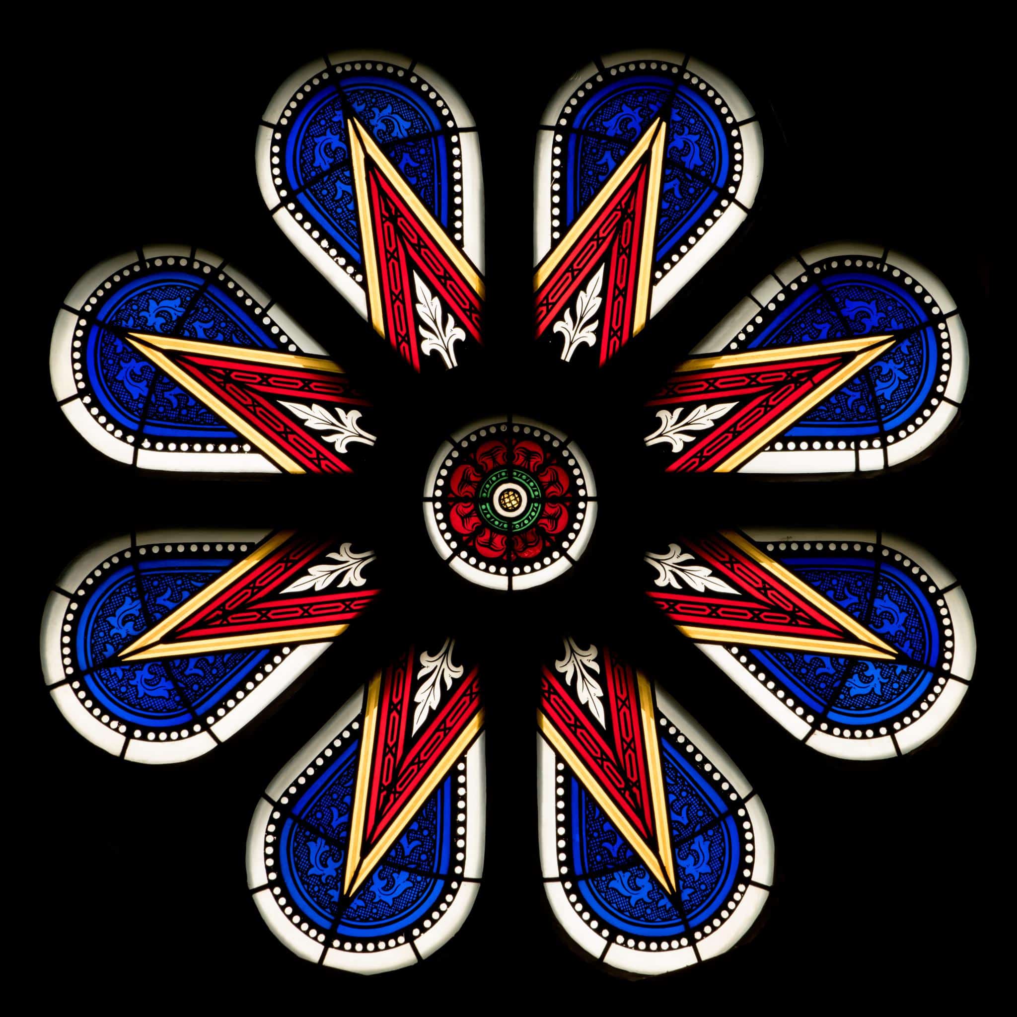 Achtpass-Rosette, verziert mit eingeschriebenem Stern und Ornamenten. Farbgestaltung in Blau, Rot und Weiss.