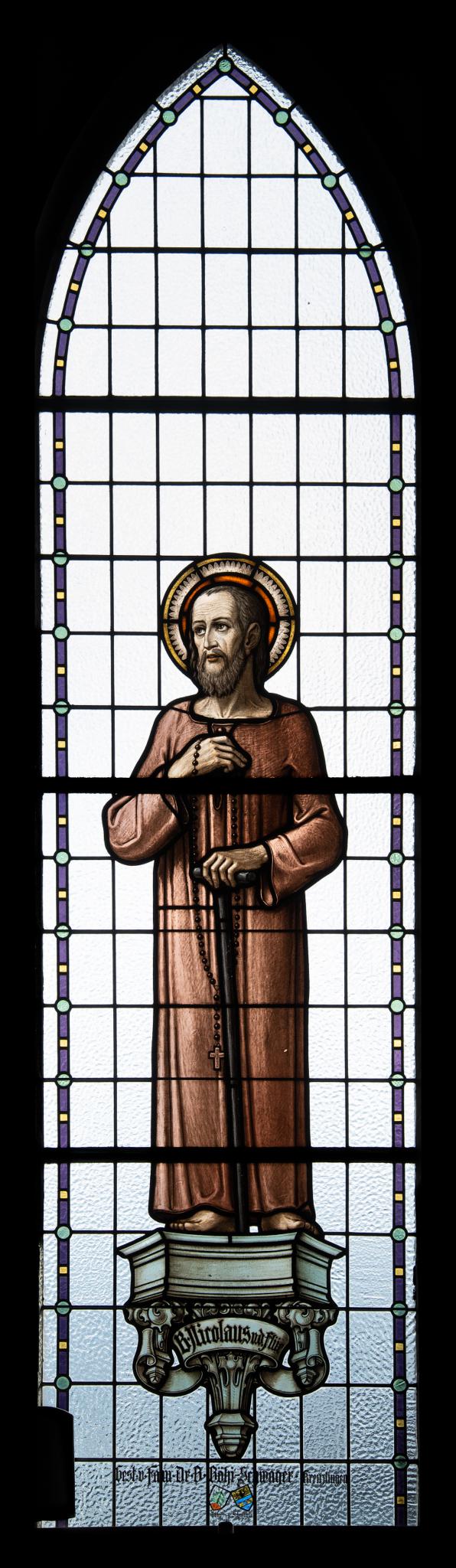 Spitzbogenfenster mit Blankverglasung in Rechtecken. Darin ist die Figur des heiligen Bruder Klaus auf einer Steinkonsole gezeigt. Der Heilige ist als Einsiedler in schlichtem braunen Gewand dargestellt, mit Stock und Gebetsschnur in den Händen. Im Sockel Schriftband mit Namenszug, im Scheibenfuss Stifterinschrift mit Wappen. Um das Fenster verläuft ein schmaler violetter Rahmen, der von hellgrünen Punkten und gelben Quadraten unterbrochen wird.