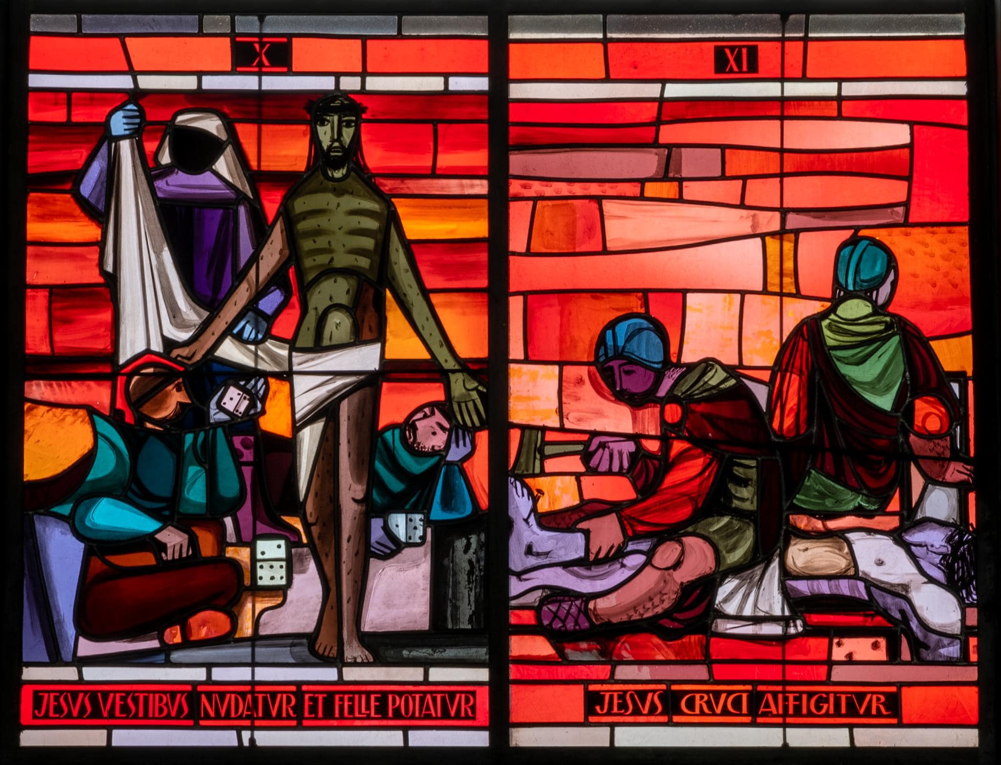 Rundbogenfenster mit blanker Rautenverglasung. Im unteren Teil des Fensters die zehnte und elfte Station des Kreuzweges: Links wird Christus entkleidet, rechts an das Kreuz genagelt.
