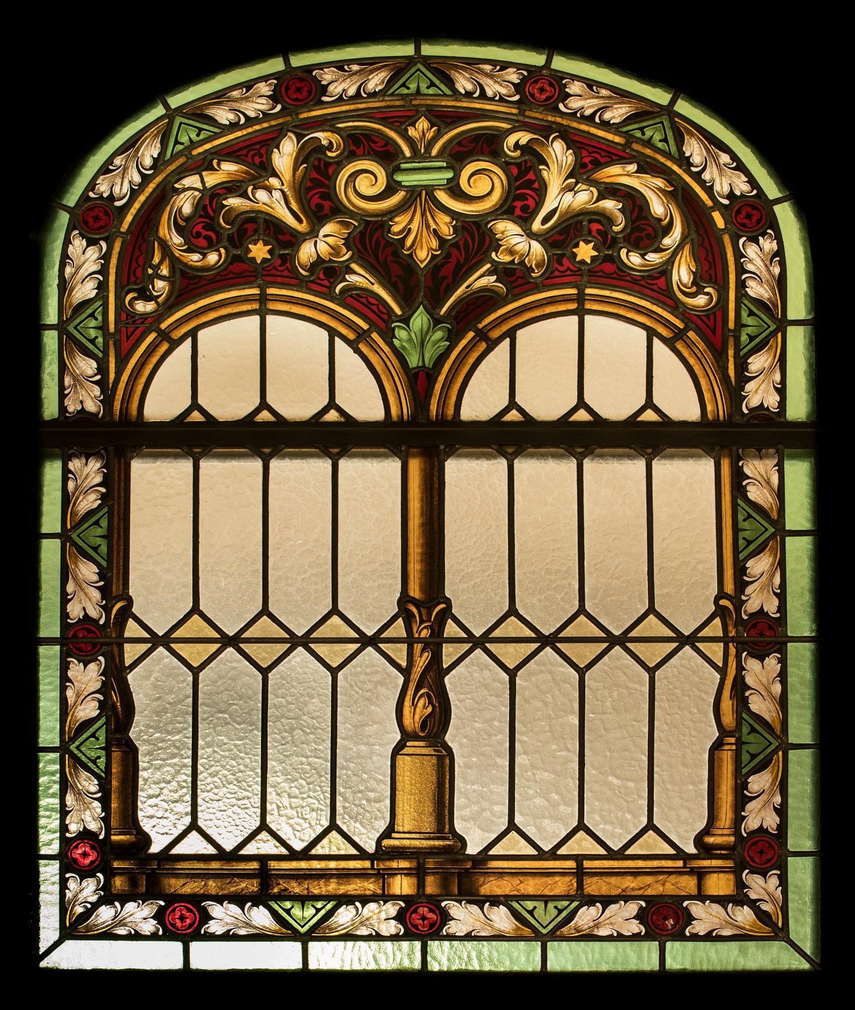 Korbbogenfenster mit Schweizerrauten, rundbogiger Arkadenrahmung und üppiger floraler Randverzierung. Im Bogenfeld Blattrankenmotiv und Sterne auf Damasthintergrund. Grundfarben Gelb, Grün, Rot (identisch mit s V).