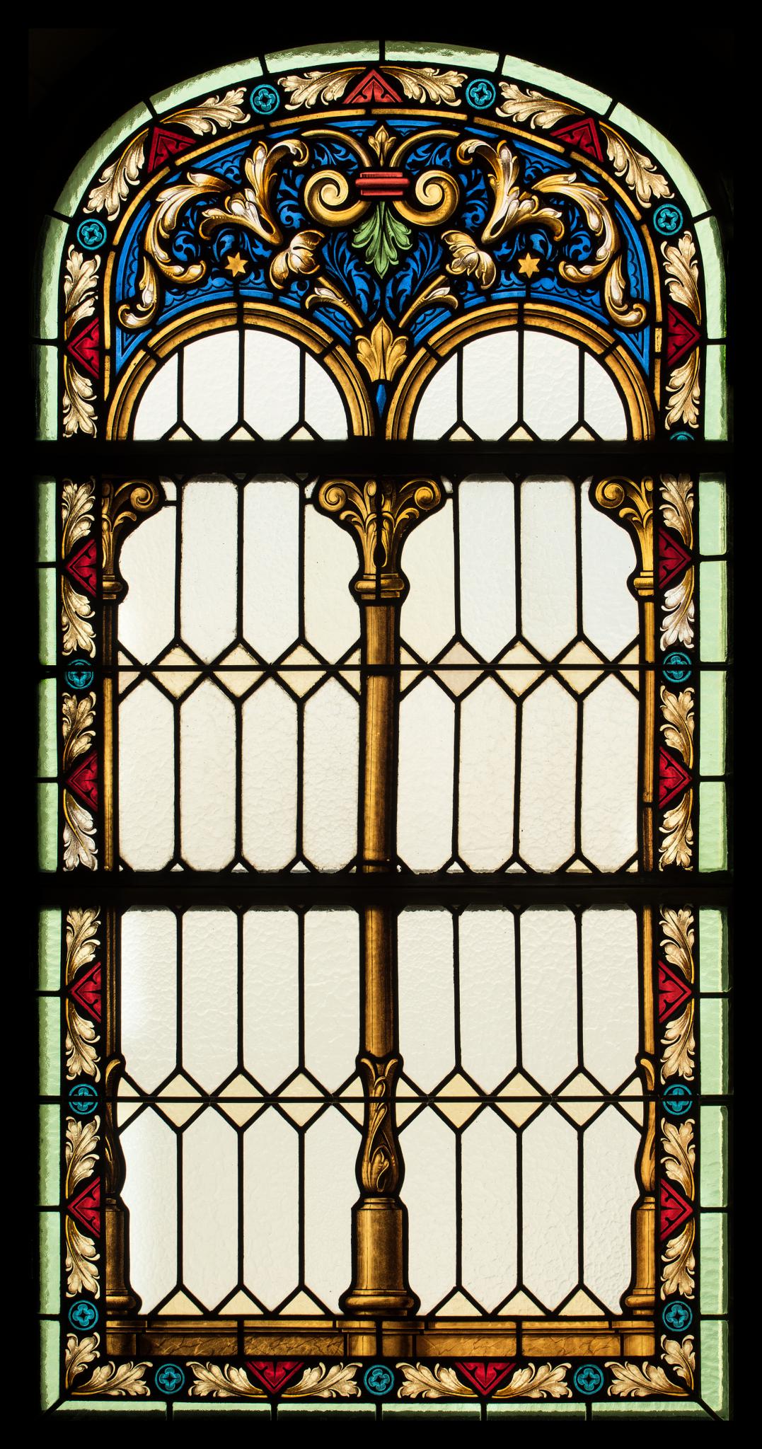 Korbbogenfenster mit Schweizerrauten, rundbogiger Arkadenrahmung und üppiger floraler Randverzierung. Im Bogenfeld Blattrankenmotiv und Sterne auf Damasthintergrund. Grundfarben Gelb, Blau, Rot (identisch mit s IV).